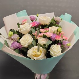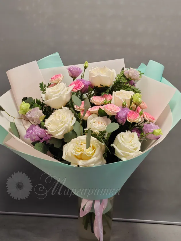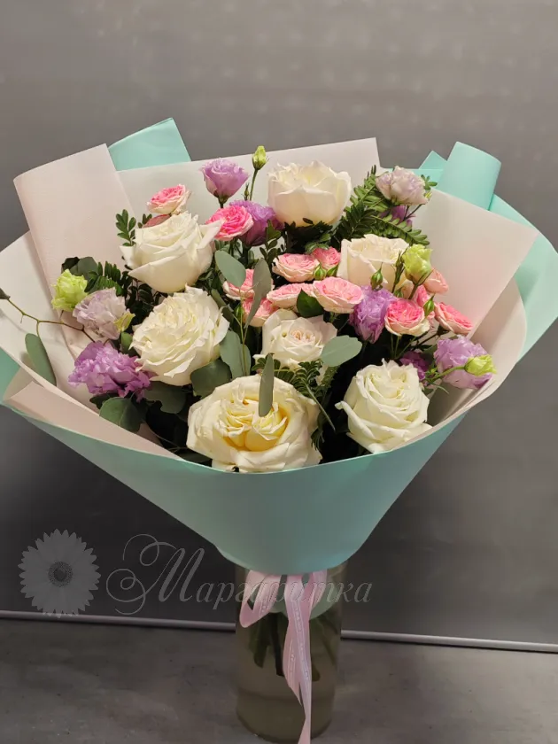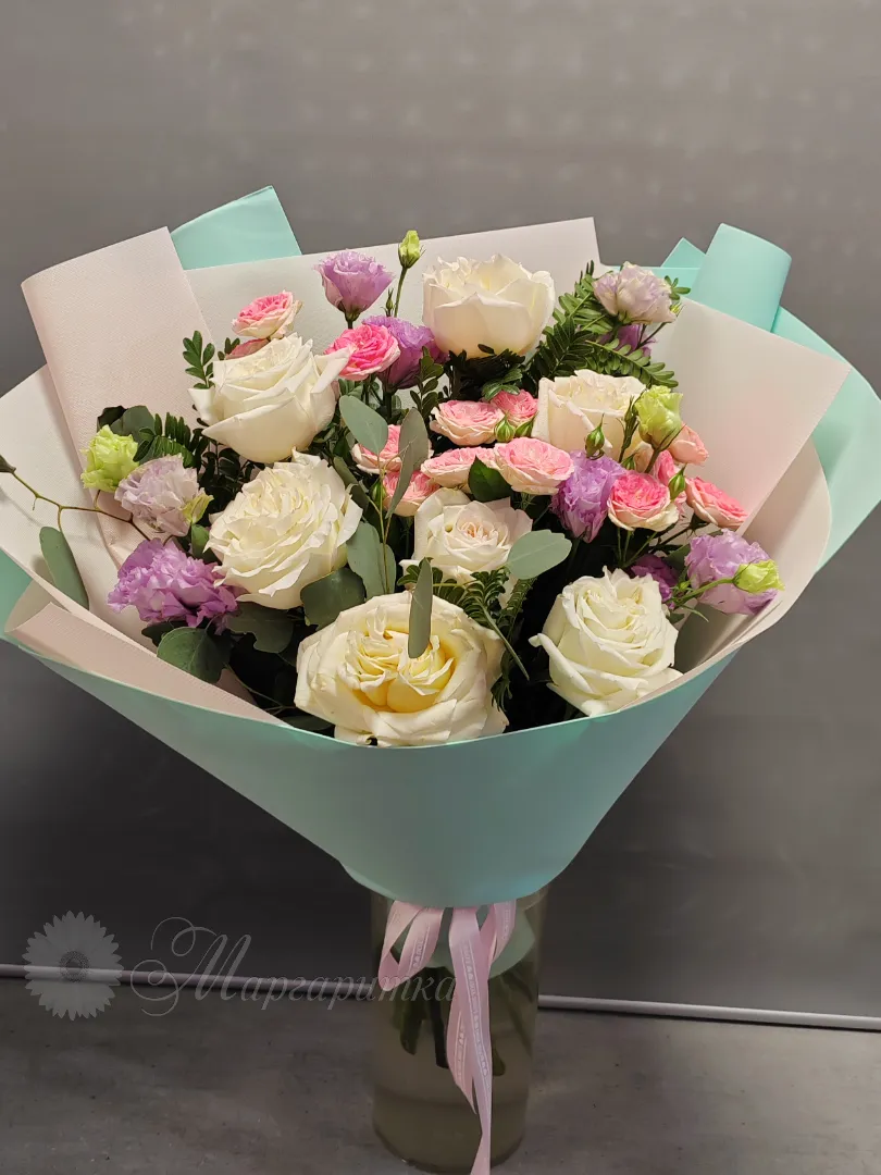 Букет, представленный на изображении, являет собой великолепную композицию, состоящую из белых роз и разноцветных гвоздик розовых и фиолетовых. Нежные оттенки цветов создают атмосферу лёгкости и изящества. Букет красиво оформлен в светлую голубовато-зелёную упаковку, что придаёт ему свежий и современный вид.