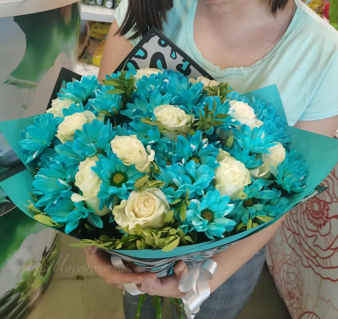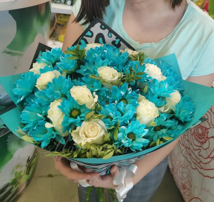 Хризантема цвета морской волны в сборном букете с молочными розами в оригинальной упаковке