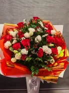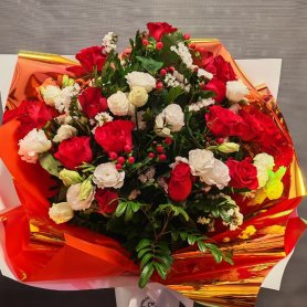 Букет из роз белого и красного цвета с добавлением зелени и мелких белых и красных цветов, элегантно упакованный в яркую оранжево-золотую обёртку. Этот букет представляет собой гармоничное сочетание контрастных оттенков и текстур, создавая впечатление роскошного и изысканного подарка. Букет станет прекрасным выражением любви и признательности.