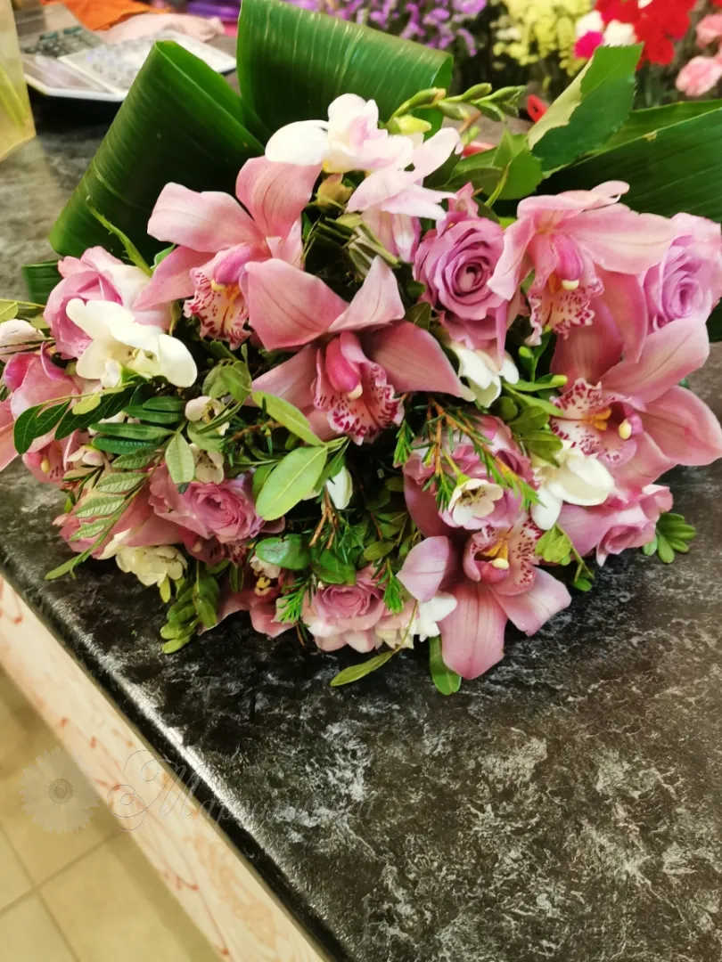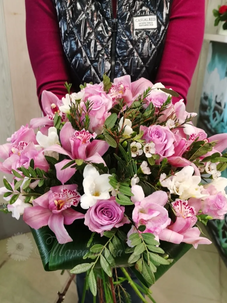 Ароматный букет из ирисов и роз, дополненный орхидеями