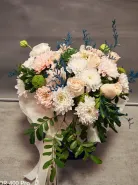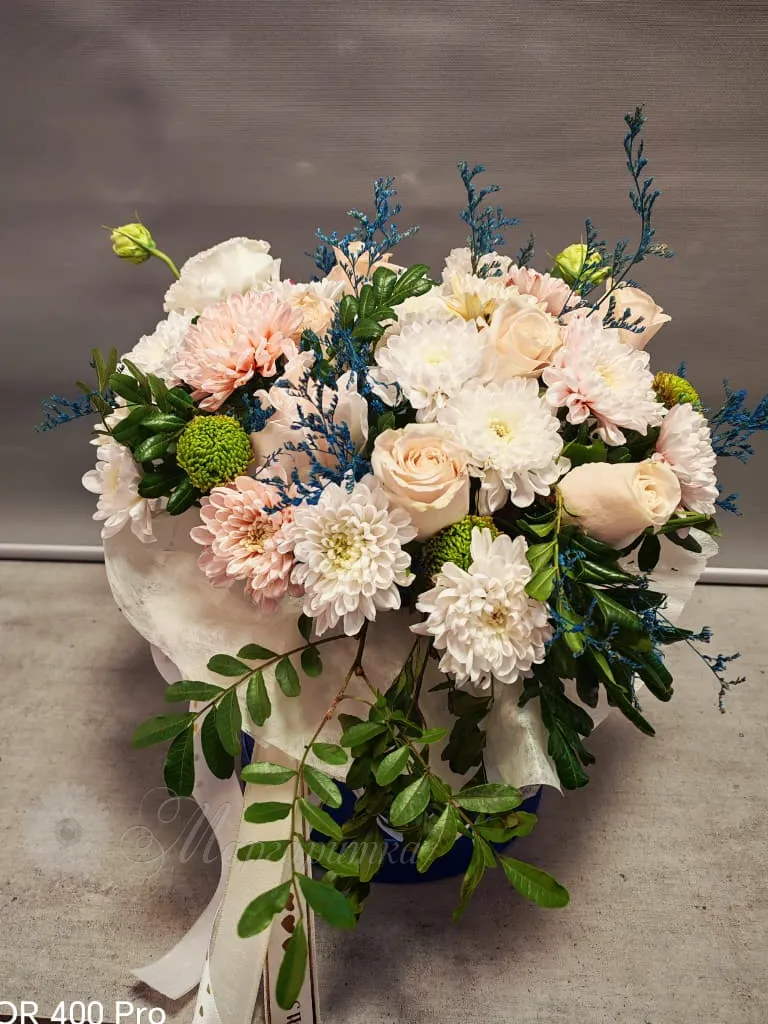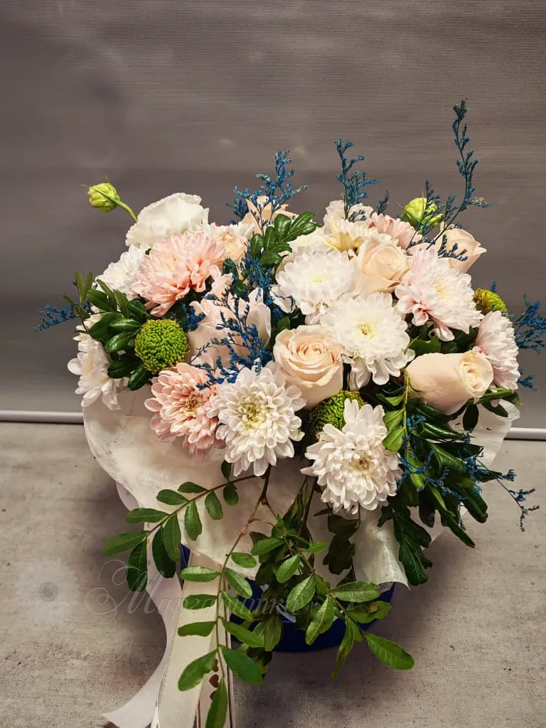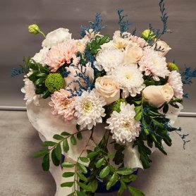 Букет, созданный из белых и нежно-розовых роз, гвоздик и хризантем, дополненный изумрудной зеленью и синими акцентами, выглядит элегантно и воздушно. Нежные оттенки цветов создают романтичную атмосферу, а ажурные веточки добавляют композиции лёгкость и объём. Этот букет станет прекрасным подарком для самых дорогих людей.