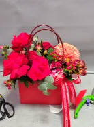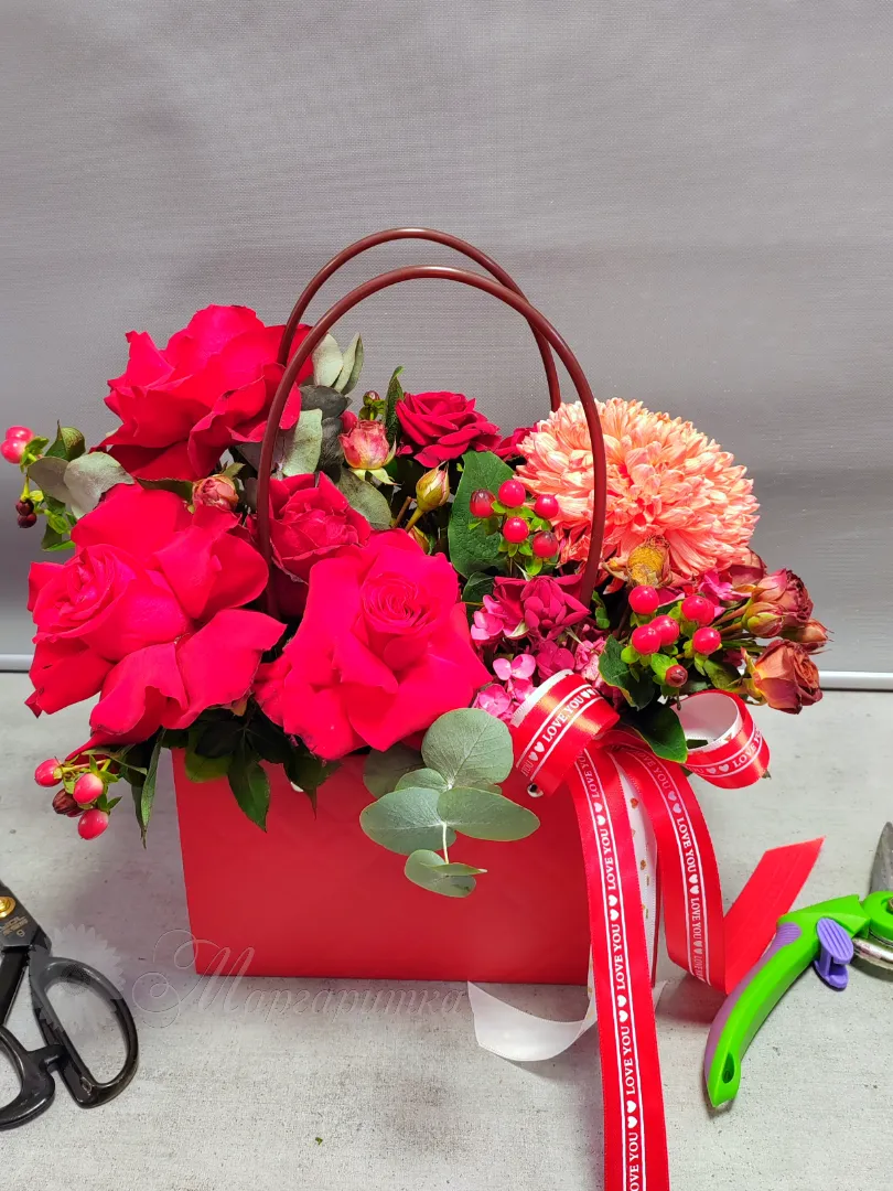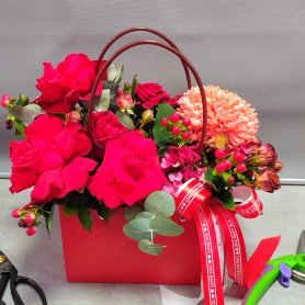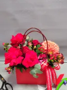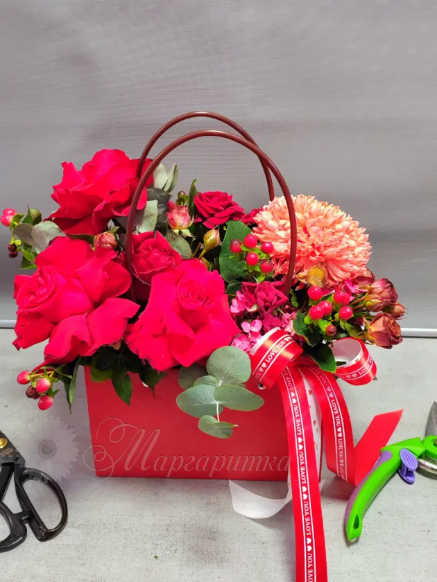 Букет в яркой красной коробке с ручкой, украшенный роскошными розовыми и красными розами, нежными пионами и свежими веточками эвкалипта. Красная лента с надписью « » добавляет композиции трогательный и романтический акцент. Этот букет станет прекрасным подарком для самых близких и любимых.