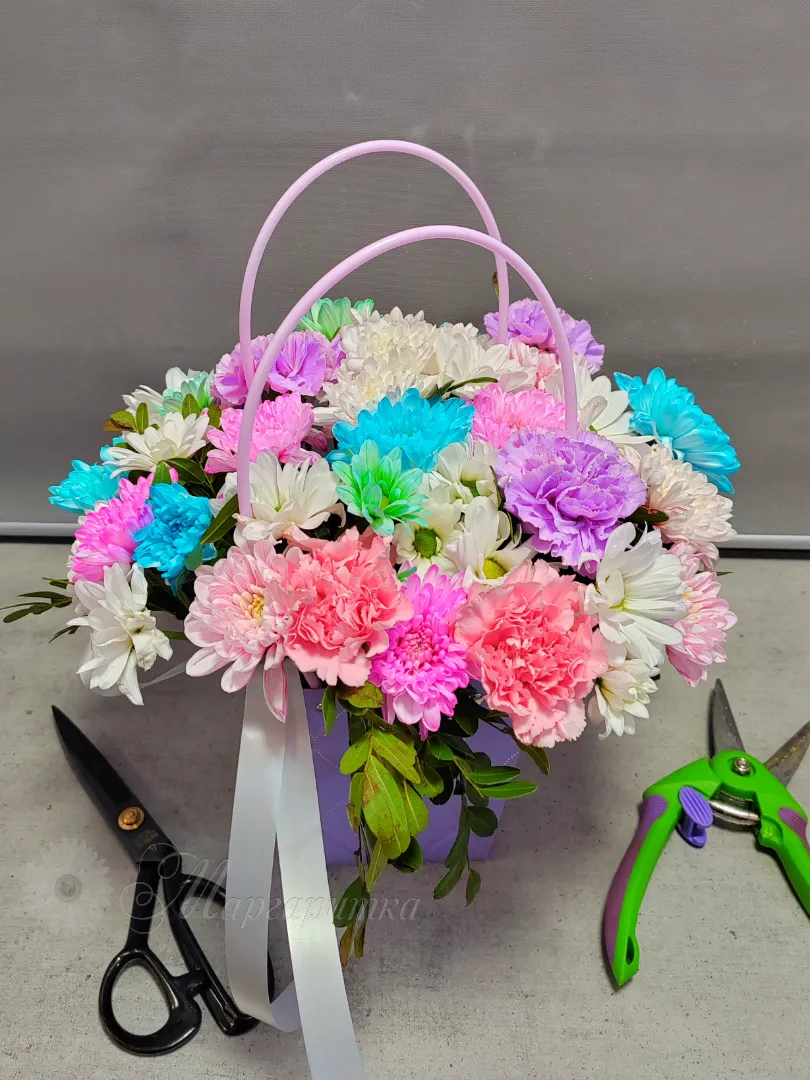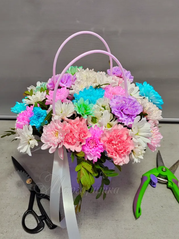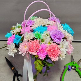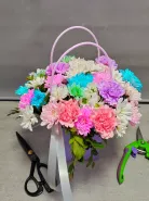 Нежный букет в светло-розовой корзинке с яркими гвоздиками и лилиями в пастельных тонах станет прекрасным подарком для близких. Аранжировка украшена атласной лентой и идеально подойдет для любого торжества. Букет излучает тепло и радость, наполняя пространство светом и уютом.