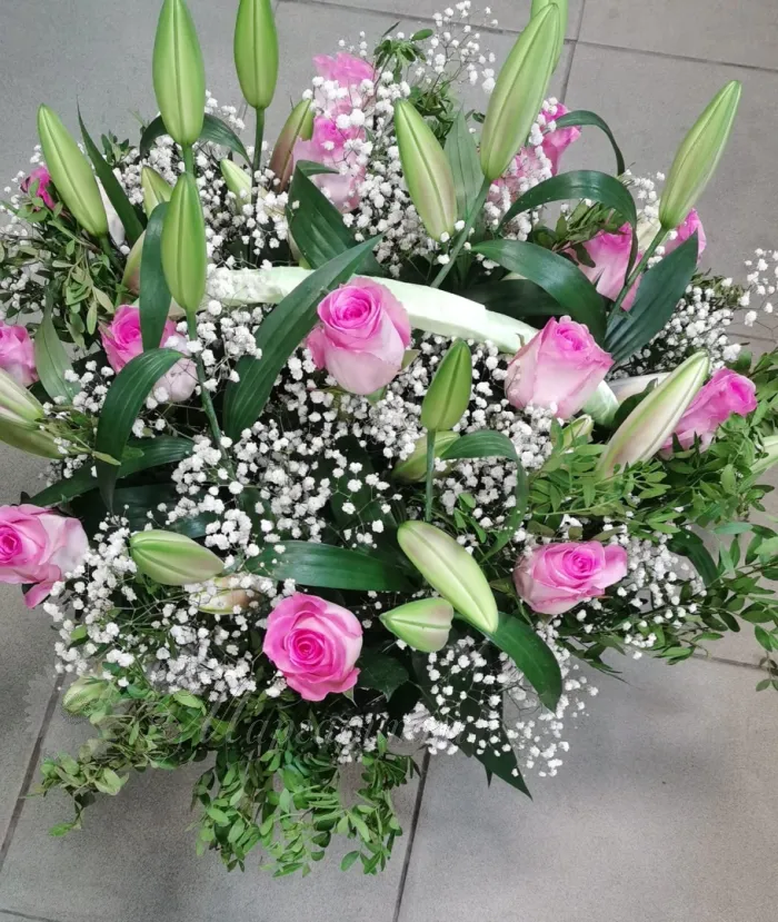 Прекрасная цветочная композиция в корзине с ароматными лилиями и розами