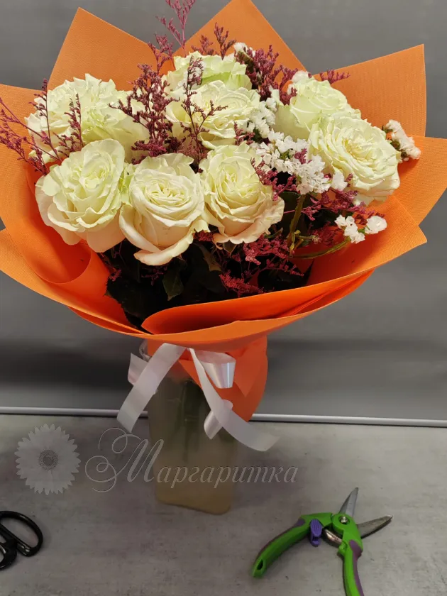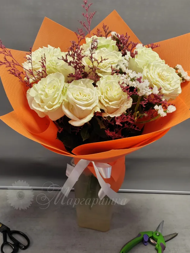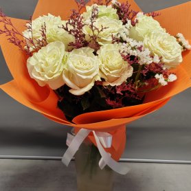 Букет, состоящий из белых роз, деликатно дополненный мелкими белыми цветами и веточками с сухими бордовыми элементами, создает элегантное и выразительное сочетание. Благодаря продуманному сочетанию текстур и оттенков букет приобретает объем и изящество. Бумажная обертка насыщенного оранжевого цвета добавляет яркость и делает букет еще более выразительным.