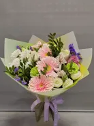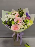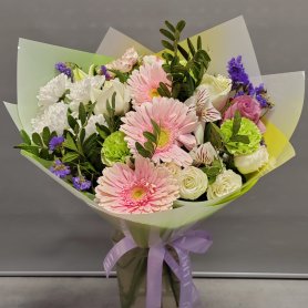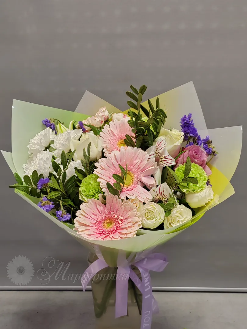 Букет, представленный на изображении, - это нежное и элегантное сочетание розовых, белых и фиолетовых цветов, идеально подходящее для выражения нежных чувств. Составленный из свежих гербер, роз и гвоздик, этот букет излучает тепло и заботу. Нежная лента с трогательной надписью добавляет особый шарм, делая его идеальным подарком для любимых.
