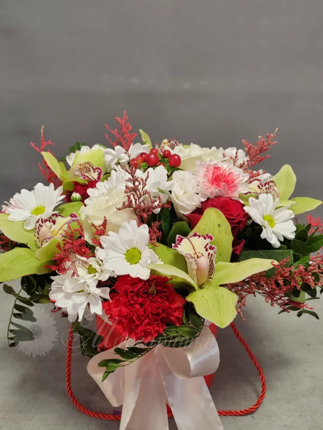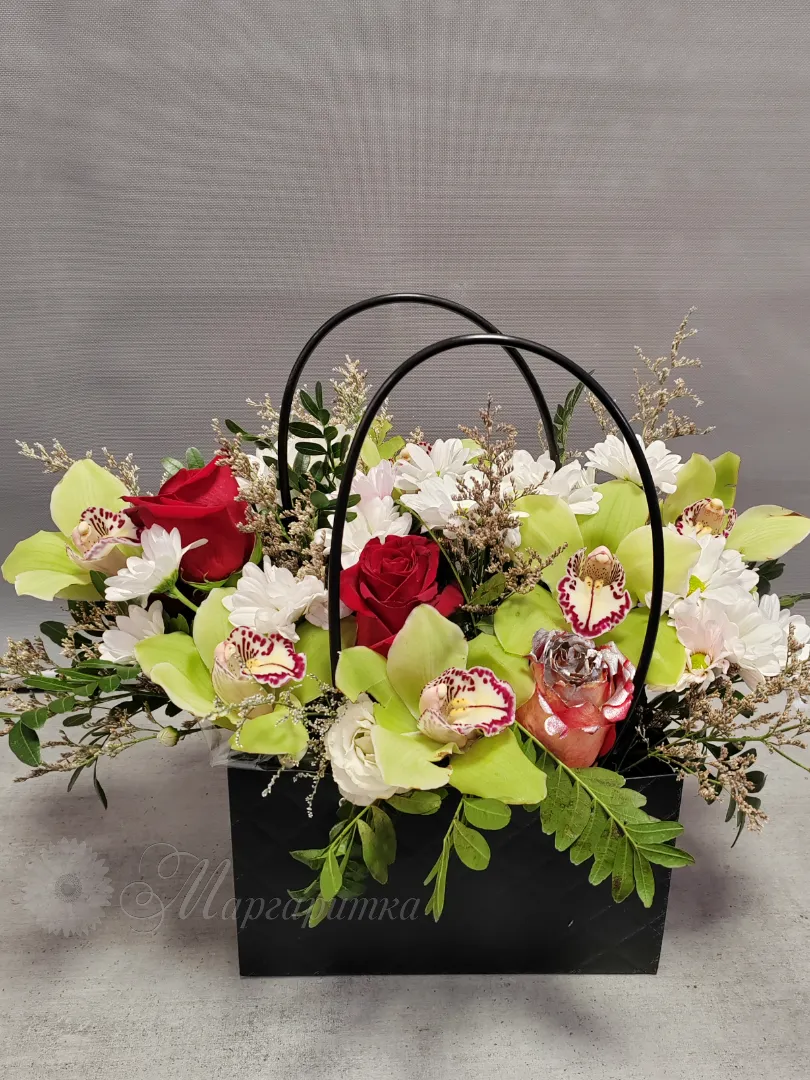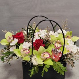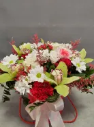 Этот букет - элегантная композиция из розовых и белых орхидей, белых роз и красных гвоздик, дополненная аспарагусом и декоративными веточками, в элегантной черной квадратной коробке с металлической ручкой. Букет идеально подходит для подарка или украшения интерьера. Композиция наполнена нежностью и изяществом, создавая атмосферу тепла и уюта.