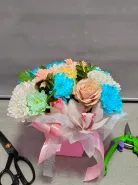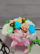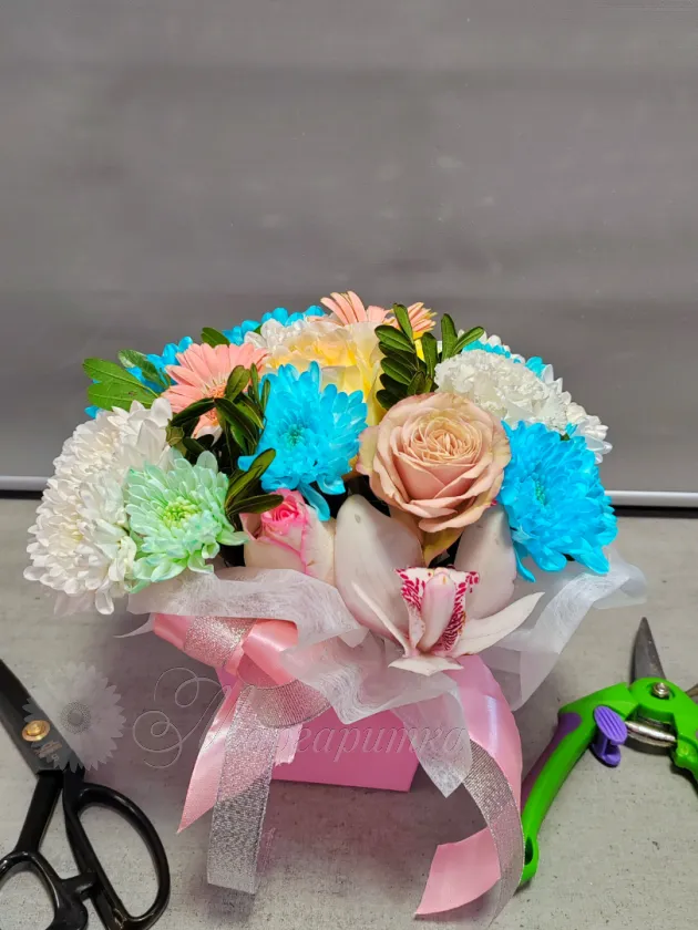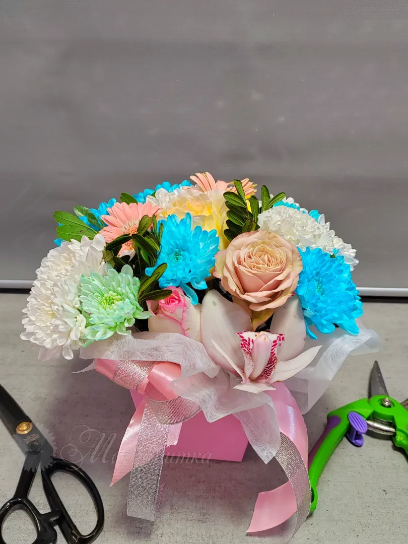 Искусственный букет в розовой коробке, перевязанный лентой, создает праздничное настроение. Нежные оттенки розовых, белых и голубых цветов гармонично сочетаются между собой, добавляя композиции воздушность и элегантность.
