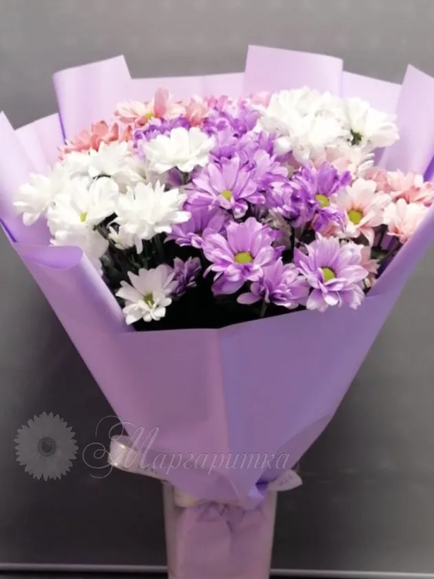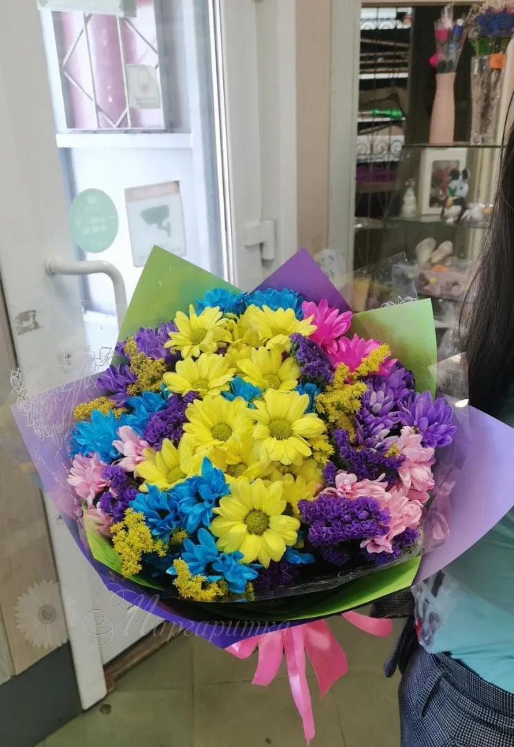 Монобукет из разноцветных хризантем для поднятия настроения!