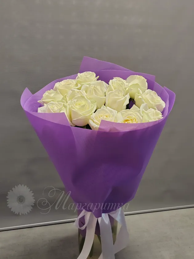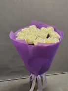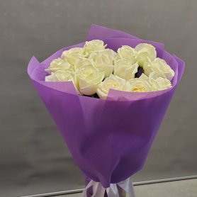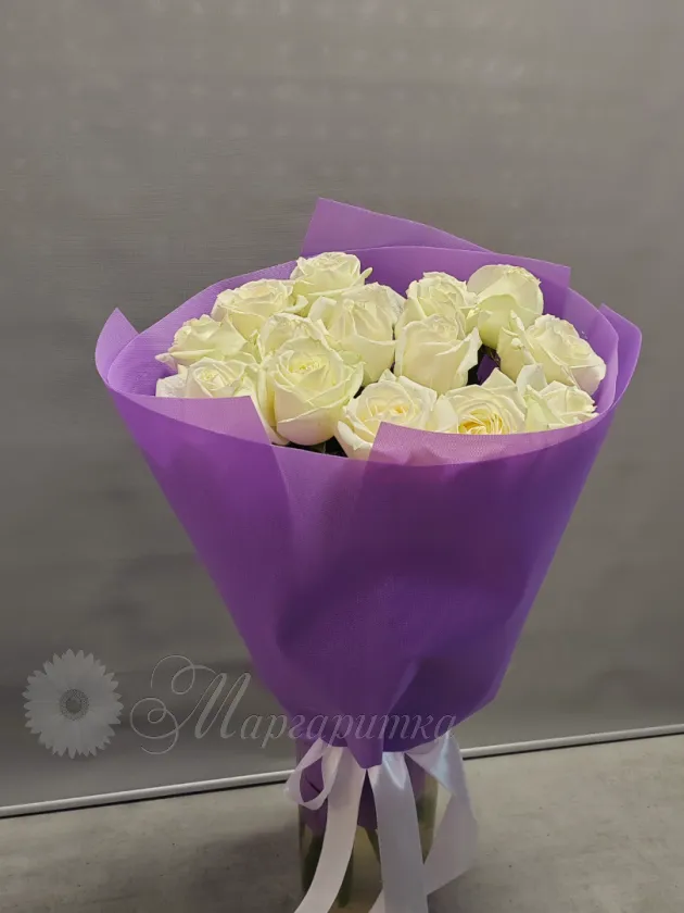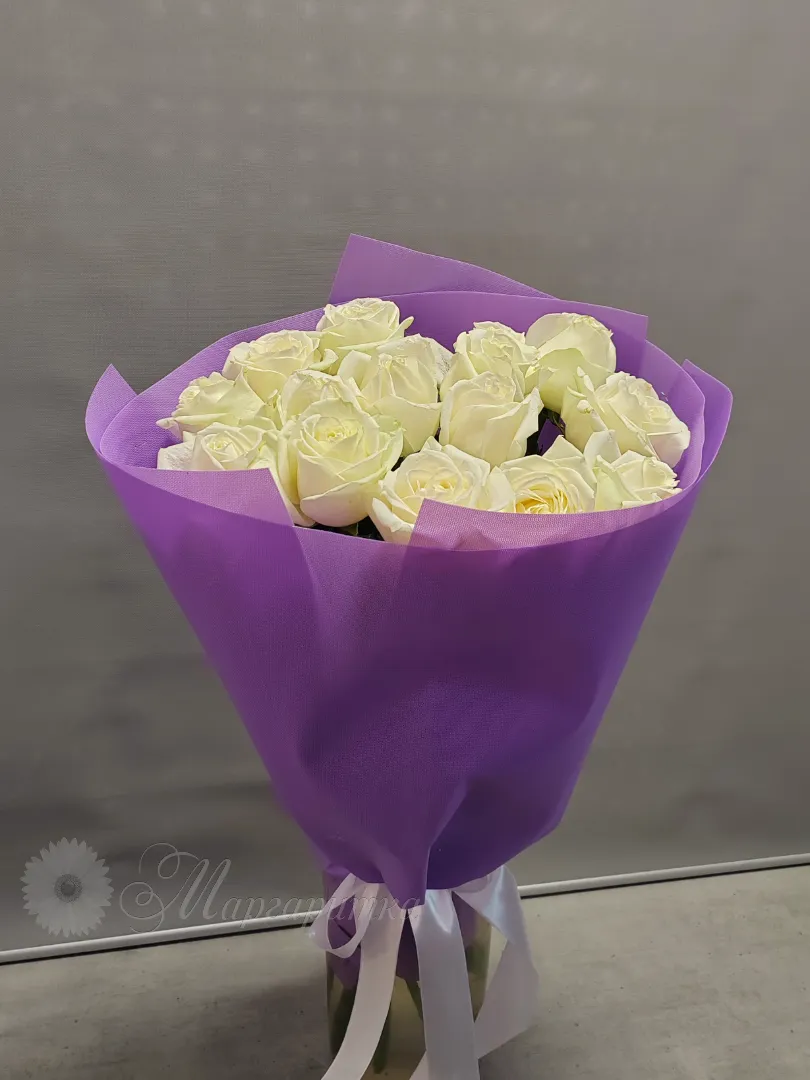 Букет, состоящий из нежных белых роз, элегантно завёрнутый в лиловую бумагу и дополненный белой лентой, создаёт образ утончённости и гармонии. Белые розы символизируют чистоту и искренность, делая композицию прекрасным выбором для любого торжественного случая. Этот букет станет изысканным подарком, выражающим самые светлые чувства.